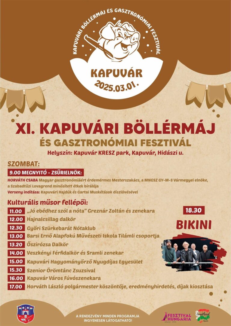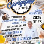 Kocsonyafesztivál Miskolc Időpont: 2026. február 6-8. Helyszín: Miskolc Belépés: INGYENES Február 6 – Péntek NAGYSZÍNPAD14:30 – 15:00FELVONULÁS ÉS MEGNYITÓ15:00 – 16:00KACSENYÁK AKUSZTIK16:00 – 16:30DJ ATTI16:30 – 17:45BROOK17:45 – 19:00BOHEMIAN BETYARS20:00 – 21:30IRIE MAFFIA22:30 – 23:45DZSÚDLÓ23:45 – 00:30DJ ATTI RETRO SZÍNPAD15:00 – 17:00WIRE17:00 – 19:00VERES LACI19:00 – 19:40SIPOS F. TAMÁS20:30 – 21:00BETTY LOVE22:00 – 22:30GROOVEHOUSE23:00 – 00:00ERŐS…