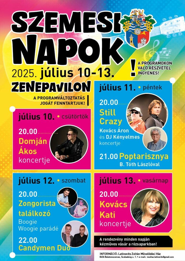 Húsvéti Nyuladalom Siófok 2026 2026. április 3 – április 6.Siófok, Fő tér A rendezvény ingyenes Április 3. Péntek 16.00 ATARU TAIKO – Japán Dobszínház műsora 17.15 Happiness TSE fellépése 19.00 Cotton Club Singers – Best of Április 4. Szombat 10.00 Kovácsovics Fruzsina gyermekkoncert 11.00 Nyúl-derby – Hozd magaddal gurulós járműved, száguldj és nyerj! játékos verseny…
