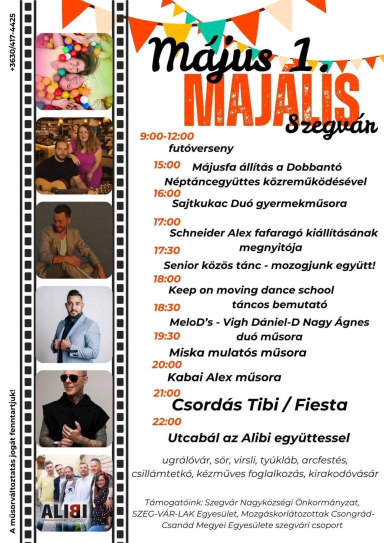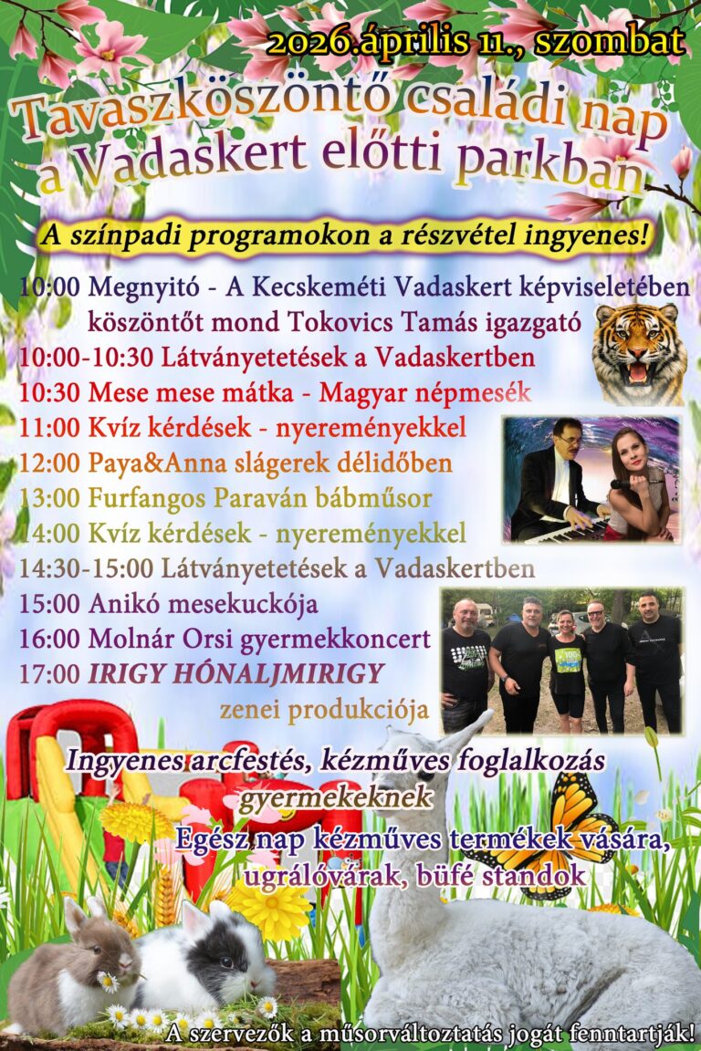 Gyulai Virágok Fesztiválja 2026 🎶 🎤 🗓️ Időpont: 2026. május 9. – 10. 📌 Helyszín: Gyula, Göndöcs-kert és Béke sgt. 💸 Belépés: INGYENES Május 9. szombat: 10:00 Szilágyi Szilárd: Bonsai alakítási gyakorlati bemutatóHelyszín: Erkel Ferenc Művelődési Központ 10:00 Fesztivál megnyitó 10:10 Energy Dance Cool Hip-Hop Táncszínház táncbemutató 11:00 A gyulai óvodások és általános iskolások kulturális…