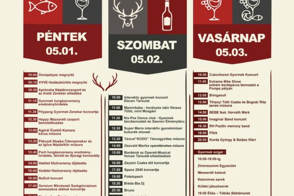 Hal–Vad–Bor–Pálinka Fesztivál Agárd Program 2026 🎶 🎤 🗓️ Időpont: 2026. május 1. – 3. 📌 Helyszín: Agárdi Szabadstrand (Üdülők útja 1.) 💸 Belépés: INGYENES Péntek (05.01.) – Ünnepélyes megnyitó, néptánc és népzenei műsorok, főzőversenyek, valamint esti koncertek (pl. Mr. G Blues Band, Tűzveszély Blues Band) Szombat (05.02.) – Családi és gyermekprogramok, táncbemutatók, operett és élőzenei fellépések,…