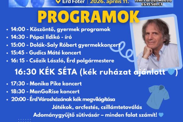 Ragyogj kéken – az autizmus világnapja Érden 🎶 🎤 🗓️ Időpont: 2026. április 11. 📌 Helyszín: Érd, Fő tér 💸 Belépés: INGYENES Egy közös séta az elfogadásért, az autizmussal élő gyermekekért és családjaikért. Fellépők: Pápai Ildikó Dolák-Saly Róbert Gudics Máté Monika Pike ManGoRise 16:30 – Kék séta (öltözz kéken! ) Tombola • Gyermekprogramok • Adománygyűjtő sütivásár A részvétel ingyenes. Adományoddal a nyári, ingyenes SZIKRA Tábor…