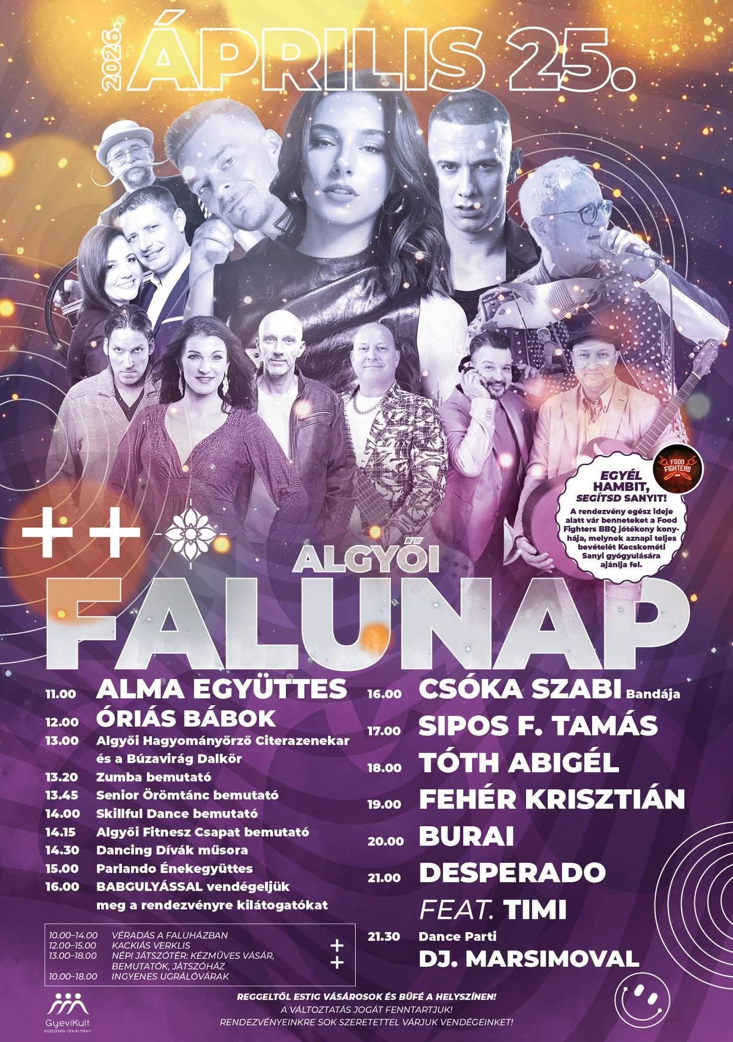 Családi programokCsongrád-Csanád vármegyeKoncertekMajálisProgramokFalunap Algyő 2026 – Fehér Krisztián, Burai, Desperado feat. Timi, Tóth Abigél, Alma Együttes ADMIN15 óra ezelőtt15 óra ezelőtt01 mins Falunap Algyő Program 2026 🎶 🎤 🗓️ Időpont: 2026. április 25.📌 Helyszín: Algyő💸 Belépés: INGYENESRészletek a plakáton!Kép forrás: Facebook események Nézd meg hol lép fel a kedvenc zenekarod (országosan): Keresés: Zenekarok :4S Street Alma együttes Animal Cannibals Apacuka zenekar Augusztusi programok Bikini Bon-Bon Bódi Csabi Decemberi programok Delta Desperado DJ Dominique Dj Szatmári DR BRS Dánielfy Gergő Farkasházi Réka és Tintanyúl Február Fehér Krisztián Groovehouse Gudics Máté Happy Gang Hooligans Horváth Tamás Irigy Hónaljmirigy Iszkiri Josh és Betti Június Kalap Jakab Korda György és Balázs Klári Kovácsovics Fruzsina Kozmix Krisz Rudi MAGNA CUM LAUDE Mihályfi Luca Május Neoton Família New Level Empire Novemberi programok Nótár Mary Péter Sramek Soltész Rezső Szabó Ádám Szeptemberi programok V-Tech Varga Viktor Bejegyzés navigáció Előző: Majális Zsombó – AK26, Animal CannibalsKövetkező: Majális Százhalombatta – Gergely Róbert