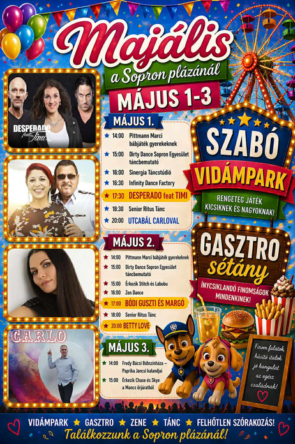 Családi programokGyerekprogramokGyőr-Moson-Sopron vármegyeKoncertekMajálisProgramokSopronMajális Sopron – Bódi Guszti & Margó, Betty Love, Desperado feat. Timi ADMIN23 óra ezelőtt23 óra ezelőtt01 mins Majális Sopron Program 2026 🎶 🎤 🗓️ Időpont: 2026. május 1. – 3.📌 Helyszín: Sopron, Sopron Pláza💸 Belépés: INGYENESRészletek a plakáton!Kép forrás: Facebook események Nézd meg hol lép fel a kedvenc zenekarod (országosan): Keresés: Zenekarok :4S Street Alma együttes Animal Cannibals Apacuka zenekar Augusztusi programok Bereczki Zoltán Bikini Bon-Bon Bódi Csabi Decemberi programok Delta Desperado DJ Dominique Dj Szatmári Dánielfy Gergő Farkasházi Réka és Tintanyúl Február Fehér Krisztián Groovehouse Gudics Máté Happy Gang Hooligans Horváth Tamás Irigy Hónaljmirigy Iszkiri Josh és Betti Június Kalap Jakab Korda György és Balázs Klári Kovácsovics Fruzsina Kozmix Krisz Rudi MAGNA CUM LAUDE Mihályfi Luca Május Neoton Família Novemberi programok Nótár Mary Péter Sramek Soltész Rezső Szabó Ádám Szeptemberi programok V-Tech Varga Viktor ÉBERKÓMA Bejegyzés navigáció Előző: Városalapítók Napja és Országos Rétesfesztivál Kiskőrös 2026 – KKevin, Hooligans, Lóci Játszik, stb.Következő: Majális Nyírgyulaj