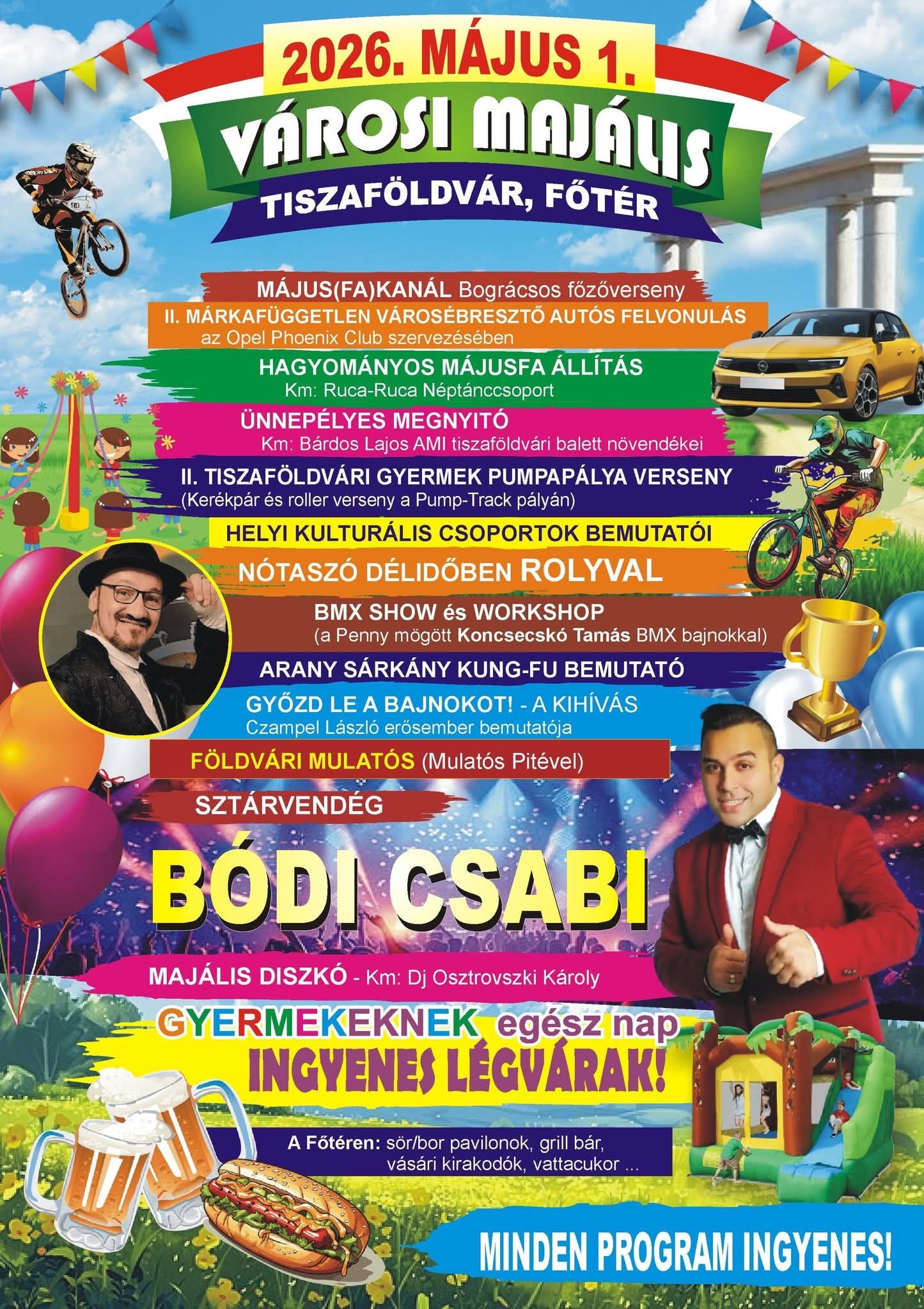 Családi programokGyerekprogramokJász-Nagykun-SzolnokKoncertekMajálisProgramokMajális Tiszaföldvár – Bódi Csabi koncert ADMIN17 óra ezelőtt17 óra ezelőtt01 mins Majális Tiszaföldvár Program 2026 🗓️ Időpont: 2026. május 1.📌 Helyszín: Tiszaföldvár, Főtér💸 Belépés: INGYENESRészletek a plakáton!Kép forrás: Facebook események Nézd meg hol lép fel a kedvenc zenekarod (országosan): Keresés: Zenekarok :4S Street Alma együttes Animal Cannibals Apacuka zenekar Augusztusi programok Bikini Bon-Bon Bódi Csabi Decemberi programok Desperado DJ Dominique Dj Szatmári Dánielfy Gergő Dér Heni Február Fehér Krisztián Groovehouse Gudics Máté Happy Gang Hooligans Horváth Tamás Irigy Hónaljmirigy Iszkiri Josh és Betti Június Kalap Jakab Korda György és Balázs Klári Kovácsovics Fruzsina Kozmix Krisz Rudi MAGNA CUM LAUDE Mihályfi Luca Május Neoton Família New Level Empire Novemberi programok Nótár Mary Oláh Gergő Péter Sramek Rúzsa Magdi Soltész Rezső Szabó Ádám Szeptemberi programok V-Tech Varga Viktor Bejegyzés navigáció Előző: Óbuda Napja 2026 – Mehringer, KFT, Kiscsillag, stb.Következő: Majális Pécs – Oláh Gergő, Bon-Bon