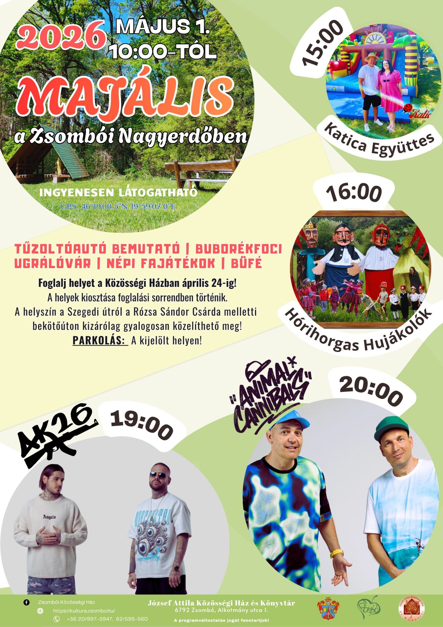 Családi programokCsongrád-Csanád vármegyeGyerekprogramokKoncertekMajálisProgramokMajális Zsombó – AK26, Animal Cannibals ADMIN15 óra ezelőtt15 óra ezelőtt01 mins Majális Zsombó Program 2026 🎶 🎤 🗓️ Időpont: 2026. május 1.📌 Helyszín: Zsombó, Nagyerdő💸 Belépés: INGYENESRészletek a plakáton!Kép forrás: Facebook események Nézd meg hol lép fel a kedvenc zenekarod (országosan): Keresés: Zenekarok :4S Street Alma együttes Animal Cannibals Apacuka zenekar Augusztusi programok Bikini Bon-Bon Bódi Csabi Decemberi programok Delta Desperado DJ Dominique Dj Szatmári DR BRS Dánielfy Gergő Farkasházi Réka és Tintanyúl Február Fehér Krisztián Groovehouse Gudics Máté Happy Gang Hooligans Horváth Tamás Irigy Hónaljmirigy Iszkiri Josh és Betti Június Kalap Jakab Korda György és Balázs Klári Kovácsovics Fruzsina Kozmix Krisz Rudi MAGNA CUM LAUDE Mihályfi Luca Május Neoton Família New Level Empire Novemberi programok Nótár Mary Péter Sramek Soltész Rezső Szabó Ádám Szeptemberi programok V-Tech Varga Viktor Bejegyzés navigáció Előző: Majális Kalocsa – Soulwave, BrandnyúlKövetkező: Falunap Algyő 2026 – Fehér Krisztián, Burai, Desperado feat. Timi, Tóth Abigél, Alma Együttes