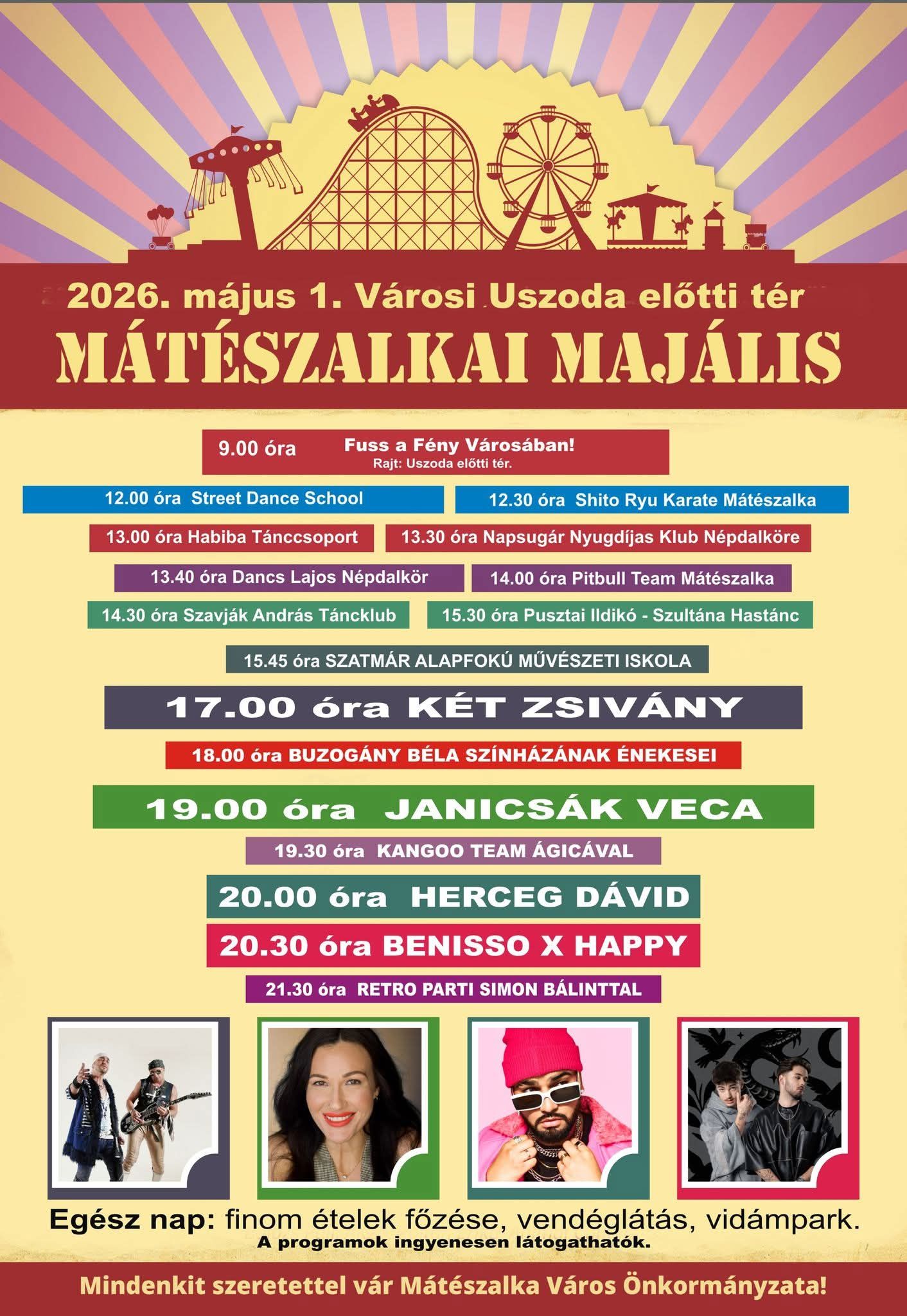 Családi programokGyerekprogramokKoncertekMajálisProgramokSzabolcs-Szatmár-Bereg megyeMátészalka Majális – Herceg Dávid, Janicsák Veca, Két zsivány ADMIN22 óra ezelőtt22 óra ezelőtt01 mins Mátészalka Majális Program 2026 🎶 🎤 🗓️ Időpont: 2026. május 1.📌 Helyszín: Mátészalka, Városi Uszoda előtti tér💸 Belépés: INGYENESRészletek a plakáton!Kép forrás: Facebook események Nézd meg hol lép fel a kedvenc zenekarod (országosan): Keresés: Zenekarok :4S Street Alma együttes Animal Cannibals Apacuka zenekar Augusztusi programok Bereczki Zoltán Bikini Bon-Bon Bódi Csabi Decemberi programok Delta Desperado DJ Dominique Dj Szatmári Dánielfy Gergő Farkasházi Réka és Tintanyúl Február Fehér Krisztián Groovehouse Gudics Máté Happy Gang Hooligans Horváth Tamás Irigy Hónaljmirigy Iszkiri Josh és Betti Június Kalap Jakab Korda György és Balázs Klári Kovácsovics Fruzsina Kozmix Krisz Rudi MAGNA CUM LAUDE Mihályfi Luca Május Neoton Família Novemberi programok Nótár Mary Péter Sramek Soltész Rezső Szabó Ádám Szeptemberi programok V-Tech Varga Viktor ÉBERKÓMA Bejegyzés navigáció Előző: Tavaszi Zsongás Vásárosnamény – Josh és BettiKövetkező: Mosonmagyaróvár Majális – Neoton Família Sztárjai koncert
