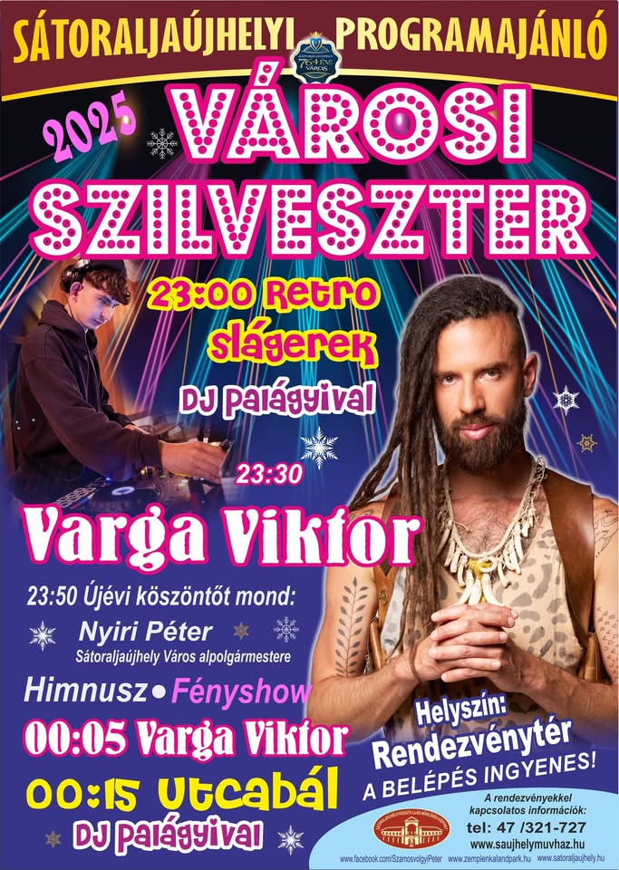Borsod-Abaúj-ZemplénCsaládi programokKoncertProgramokSátoraljaújhelySzilveszteri programokSátoraljaújhely Szilveszter 2025 – Varga Viktor koncerttel ADMIN2 nap ezelőtt2 nap ezelőtt01 perc Ingyenes programok és koncertek Sátoraljaújhely Szilveszter 2025 🗓️ Időpont: 2025. december 31. 📌 Helyszín: Sátoraljaújhely, Rendezvénytér Városi Szilveszter 2025 Programok: 23:00 – Retro slágerek DJ Palágyival 23:30 – Varga Viktor 23:50 – Ünnepi köszöntőt mond Nyiri Péter Sátoraljaújhelyváros alpolgármestere, Himnusz és Fényshow 00:05 – Varga Viktor 00:15 – Retro slágerek DJ Palágyival💸 Belépés: INGYENESKép forrás: Facebook események Bejegyzés navigáció Előző: Debrecen Szilveszter 2025 ingyenes koncertekKövetkező: Ajka Szilveszter 2025 – Kollányi Zsuzsi koncerttel