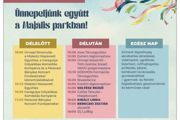 Miskolc Majális Program 2026 🗓️ Időpont: 2026. május 1. 📌 Helyszín: Miskolc, Majális Park 💸 Belépés: INGYENES Részletek a plakáton! Kép forrás: Facebook események