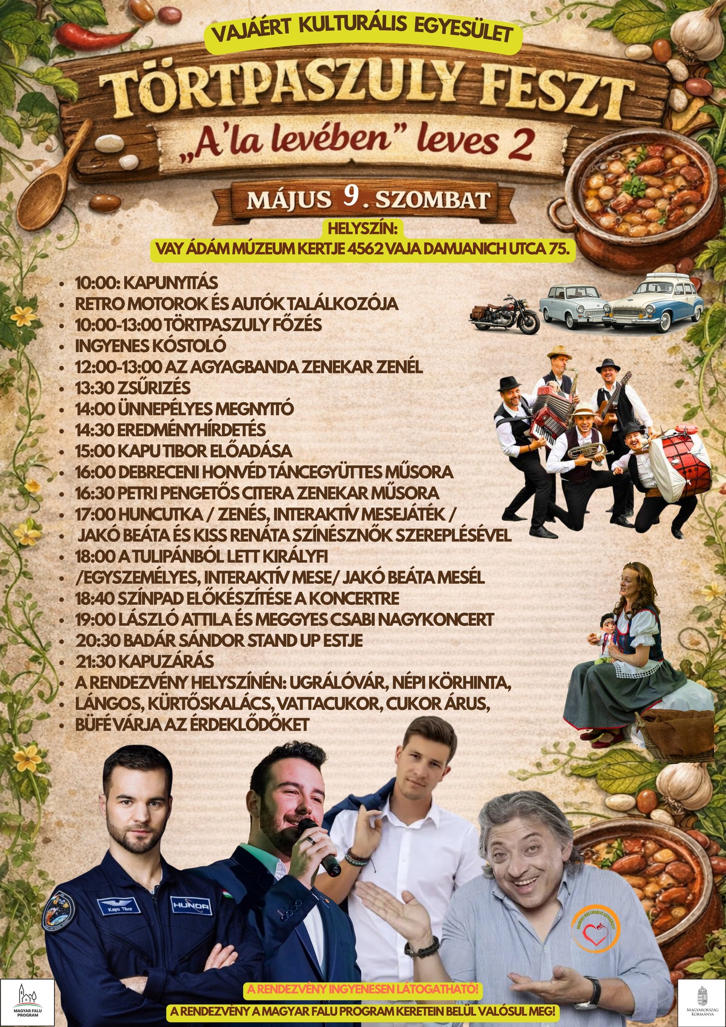 Családi programokFesztiválokGyerekprogramokKoncertekProgramokSzabolcs-Szatmár-Bereg megyeTörtpaszuly Feszt Vaja ADMIN22 óra ezelőtt14 óra ezelőtt01 mins Törtpaszuly Feszt Vaja Program 2026 🎶 🎤 🗓️ Időpont: 2026. május 9.📌 Helyszín: Vaja, Vay Ádám Múzeum kertje💸 Belépés: INGYENESRészletek a plakáton!Kép forrás: Facebook események Nézd meg hol lép fel a kedvenc zenekarod (országosan): Keresés: Zenekarok :4S Street Alma együttes Animal Cannibals Apacuka zenekar Augusztusi programok Bereczki Zoltán Bikini Bon-Bon Bódi Csabi Decemberi programok Delta Desperado DJ Dominique Dj Szatmári Dánielfy Gergő Farkasházi Réka és Tintanyúl Február Fehér Krisztián Groovehouse Gudics Máté Happy Gang Hooligans Horváth Tamás Irigy Hónaljmirigy Iszkiri Josh és Betti Június Kalap Jakab Korda György és Balázs Klári Kovácsovics Fruzsina Kozmix Krisz Rudi MAGNA CUM LAUDE Mihályfi Luca Május Neoton Família Novemberi programok Nótár Mary Péter Sramek Soltész Rezső Szabó Ádám Szeptemberi programok V-Tech Varga Viktor ÉBERKÓMA Bejegyzés navigáció Előző: Tura Majális – Tóth Tünde, Bunyós PityuKövetkező: Tavaszi Zsongás Vásárosnamény – Josh és Betti